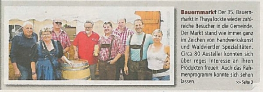 Der Bauernmarkt in Thaya ist im Waldviertel der größte seiner Art. Auch in diesem Jahr fand er wieder regen Anklang unter den Besuchern. Neben einer großen Anzahl altbewährter Attraktion, gab's auch heuer wieder viel Neues zu bewundern. So zum Beispiel die Eröffnung des "Flügl-Kellers", ein alter Erdkeller, in dem die Gäste mit hausgemachter Bauernjause und einer Weinverkostung verwöhnt wurden.